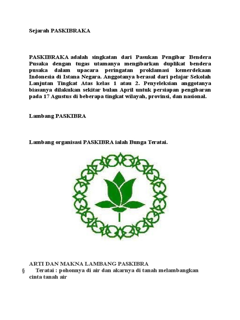 Arti lambang dan logo paskibraka indonesia untuk mempersatukan korps untuk paskibraka nasional propinsi dan kabupaten kotamadya ditandai oleh lambang korps yang sama dengan tambahan tanda lokasi terbentuknya pasukan. Pasukan pengibar bendera pusaka dan tahun 19. Idik sulaiman merupakan tokoh dibalik pembuatan lambang tersebut yang hingga kini masih digunakan sebagai lambang paskibra. Lambang anggota paskibra adalah setangkai bunga teratai yang mulai mekar dan dikelilingi sebuah gelang rantai yang mata rantainya berbentuk bulat dan belah ketupat yang berjumlah masing masing 16 buah. Dalam organisasi paskibraka ada dua lambang yaitu lambang paskibrakapaskibra yaitu bergambarkan dua pemudapemudi paskibraka menengok kekanan dengan seragam pdu adalah lambang aktif anggota paskibrapaskibraka yang sedang bertugas dan ada lambang kedua yaitu lambang purna paskibraka indonesia yang berlambangkan daun dan bunga teratai. Lotus lotus leaf alam.